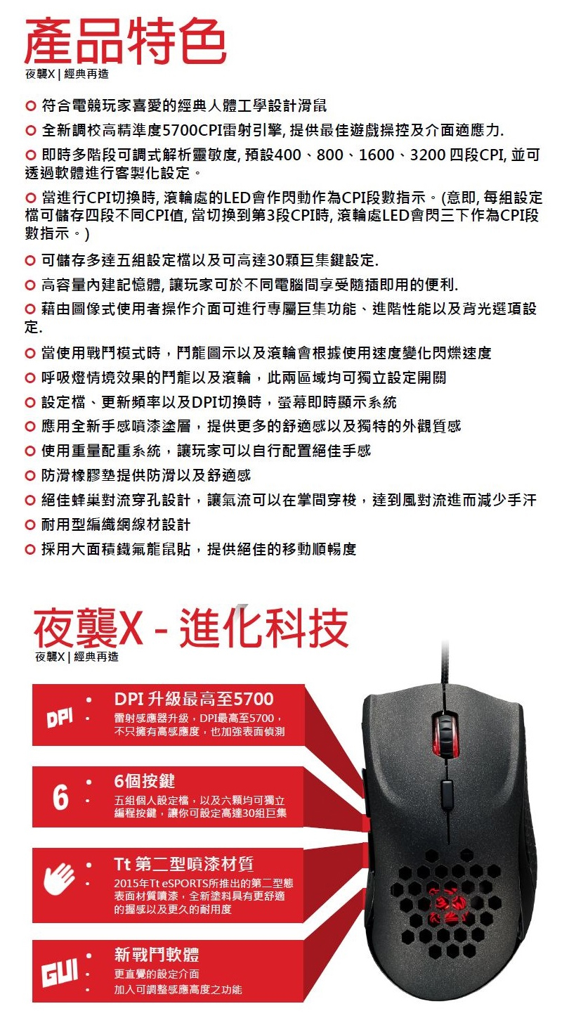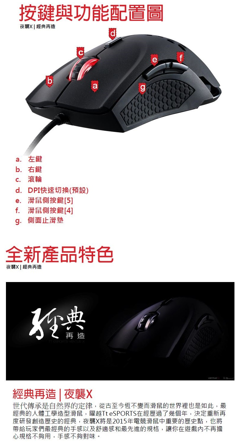有關TT 曜越 夜襲X 雷射電競滑鼠.的詳細介紹如下: Tt eSPORTS 曜越 夜襲X 雷射電競滑鼠